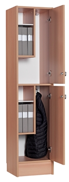 Inredning delad lucka: 2- eller 4 fack. Inv.mått/fack: Br.400xDj.370/500xH846mm. Varje fack har 1 st klädfack med hatthylla och takkrok samt 1 st förvaringsfack med 2 hyllfack för t.ex. böcker.